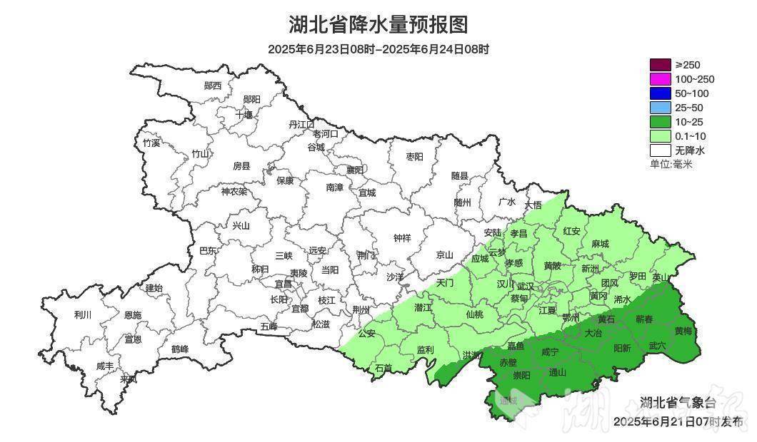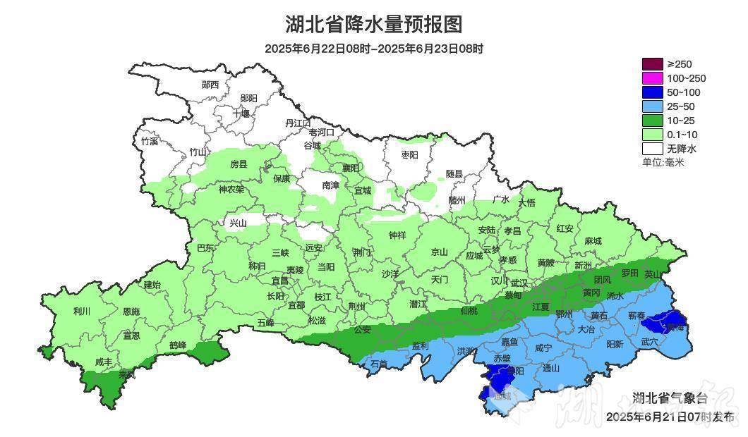 预计21日晚,黄冈、咸宁、鄂州、黄石、武汉南部有大到暴雨、局部大暴雨,伴有短时强降水。22日雨势减弱南压,江汉平原南部、鄂东南阴天有中雨,局地大雨;其他地区小雨,局部中雨;鄂西北以多云为主。23日降雨过程趋于结束,东部地区小到中雨转阴天,其他地区阴天到多云。不过,24日晚上起,新一轮降雨又将来袭。22日和23日东部地区气温略低,仅23至26℃。