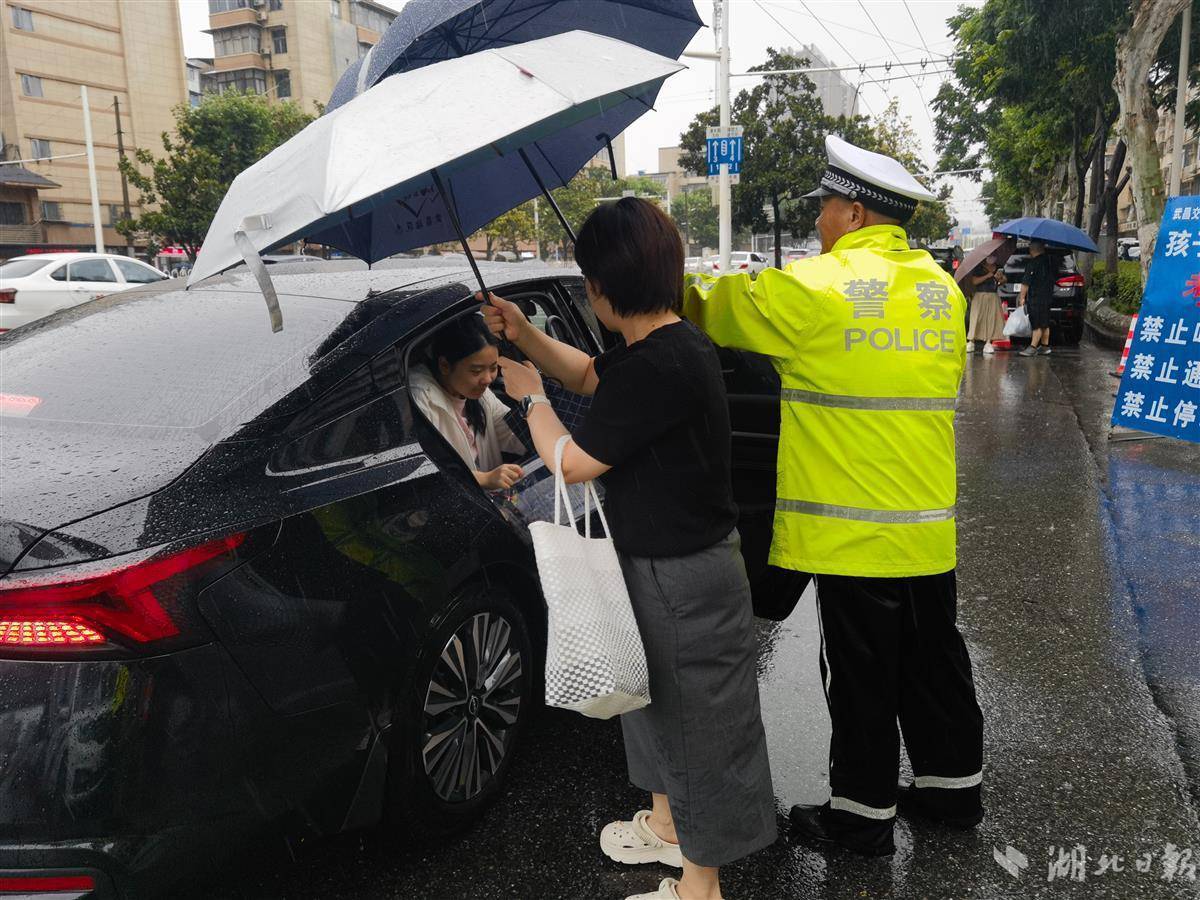 在武汉市第二职业教育中心考点,54岁的武昌交警刘五桥第17年重复着相同的动作:左手攥紧伞柄为考生遮挡车门,右手食指轻护车顶边缘。当载着考生的车辆停稳,他总会半蹲下身让伞面完全覆盖车门,沙哑的“慢点起身”混着雨声落进考生耳中。