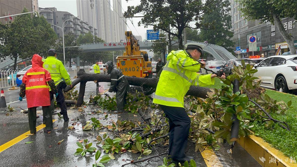 当日清晨6时30分,硚口交通大队巡逻民警发现武汉市63中学考点旁,一棵大树因连日暴雨倾斜,粗壮树干死死压在电车线上,树冠如巨伞般遮蔽半幅路面。